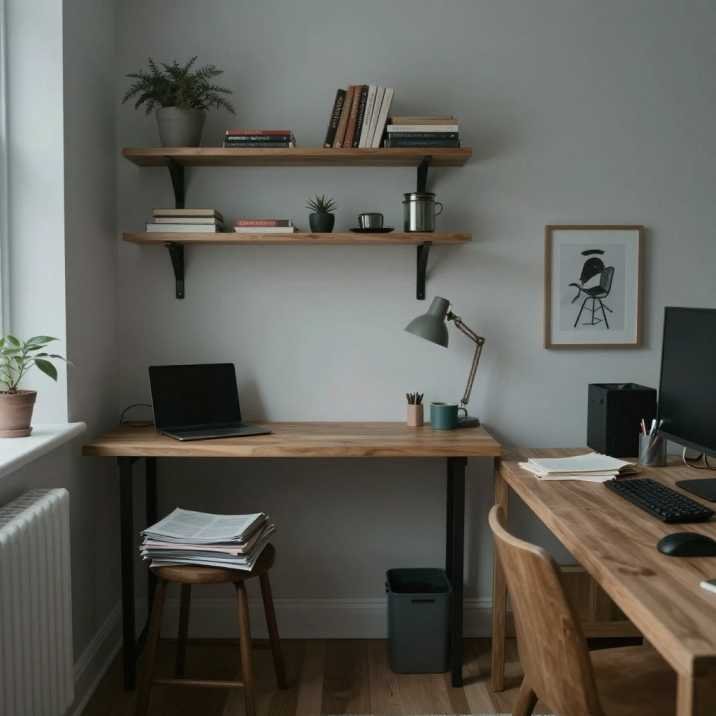 • Install slim floating shelves above desks for books and baskets.